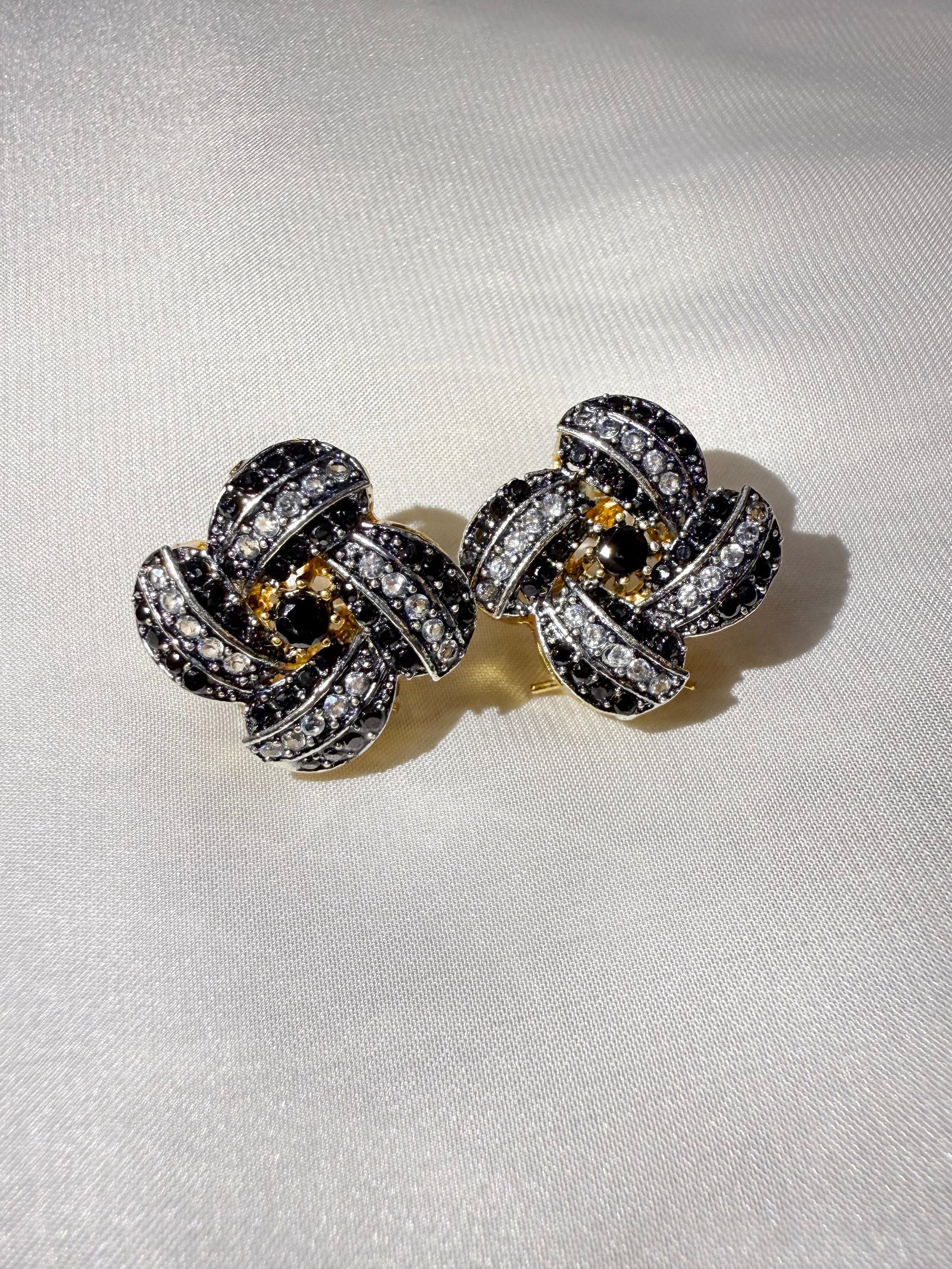 Designed in a graceful floral swirl, these studs are encrusted with shimmering white crystals and accented by black-toned stones at the center. The gold base adds a touch of warmth and luxury, perfectly balancing the cool brilliance of black and silver hues.