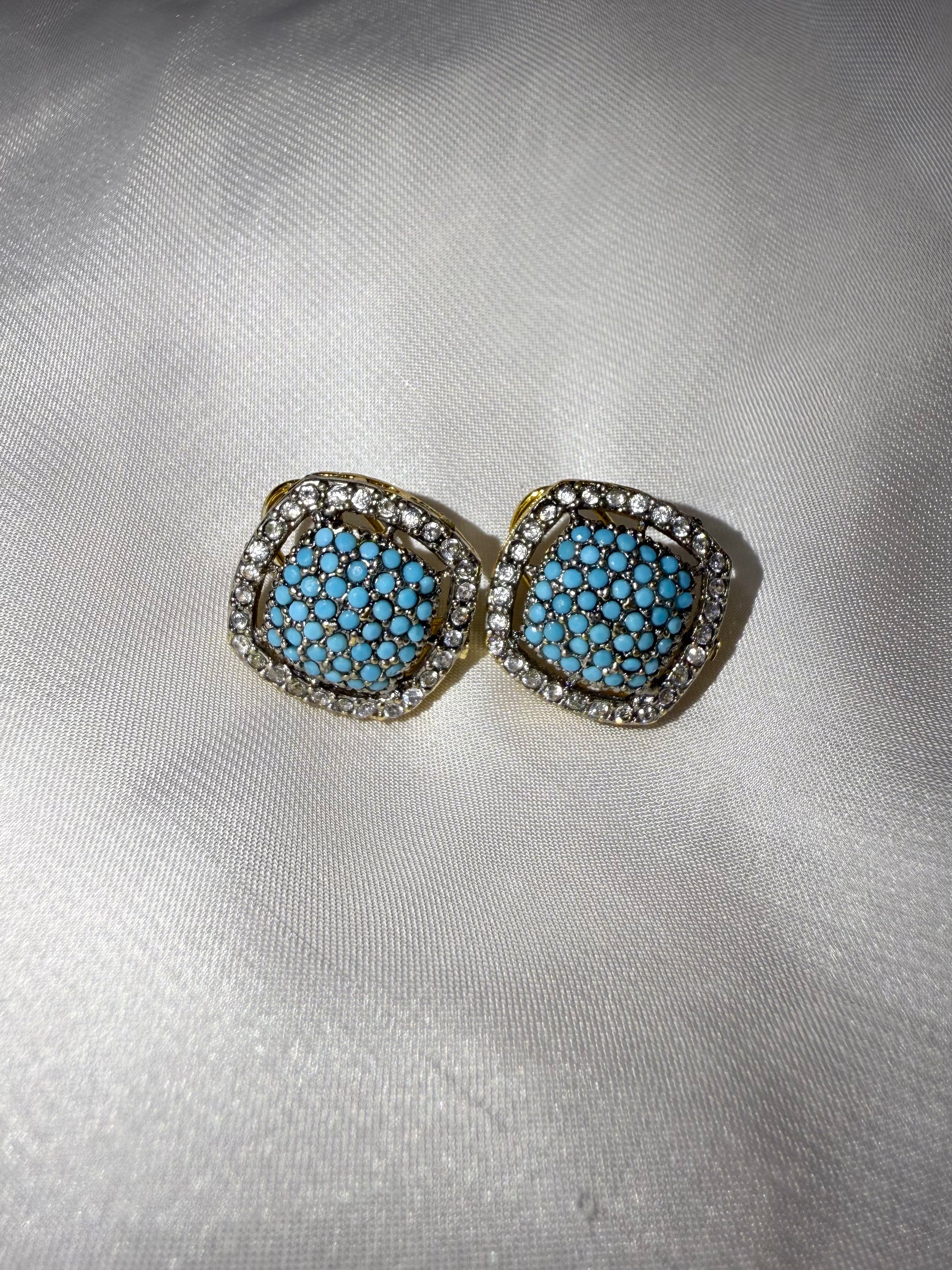 A vibrant fusion of color and sparkle, these studs feature an intricate mosaic of blue stones framed by a shimmering diamond border. Perfect for adding a royal touch to both everyday wear and festive occasions.