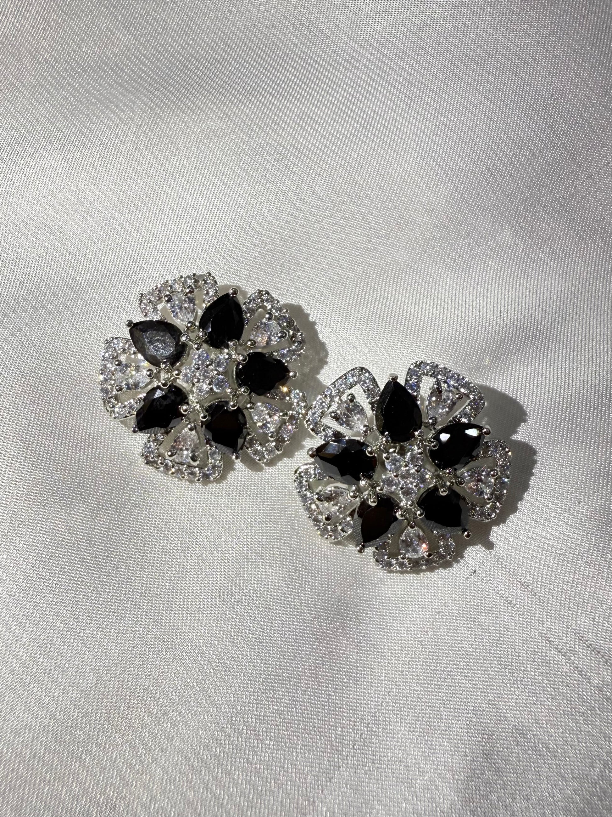 Bold black stones meet glistening crystals in this striking floral design. A chic and modern statement piece for those who love a touch of drama and sophistication.